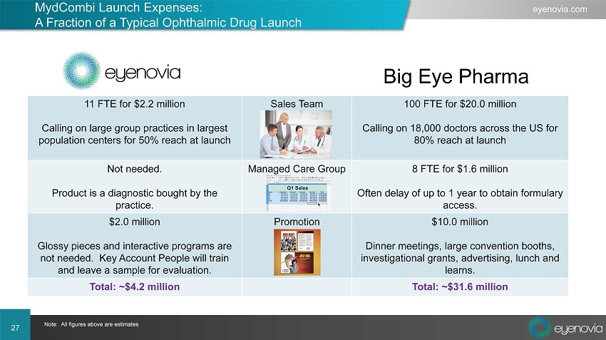 eyenovia.com 11 FTE for $2.2 million Calling on large group practices in largest population centers for 50% reach at launch Sales Team 100 FTE for $20.0 million Calling on 18,000 doctors across the US for 80% reach at launch Not needed. Product is a diagnostic bought by the practice. Managed Care Group 8 FTE for $1.6 million Often delay of up to 1 year to obtain formulary access. $2.0 million Glossy pieces and interactive programs are not needed. Key Account People will train and leave a sample for evaluation. Promotion $10.0 million Dinner meetings, large convention booths, investigational grants, advertising, lunch and learns. Total: ~$4.2 million Total: ~$31.6 million 27 Note: All figures above are estimates Big Eye Pharma MydCombi Launch Expenses: A Fraction of a Typical Ophthalmic Drug Launch
