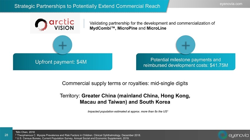 eyenovia.com Validating partnership for the development and commercialization of MydCombi Œ , MicroPine and MicroLine 28 Strategic Partnerships to Potentially Extend Commercial Reach Upfront payment: $4M Potential milestone payments and reimbursed development costs: $41.75M Commercial supply terms or royalties: mid - single digits Territory: Greater China (mainland China, Hong Kong, Macau and Taiwan) and South Korea 1 Min Chen, 2018 2 Theophanous C. Myopia Prevalence and Risk Factors in Children. Clinical Ophthalmology. December 2018. 3 U.S. Census Bureau, Current Population Survey, Annual Social and Economic Supplement, 2019. Impacted population estimated at approx. more than 8x the US 1