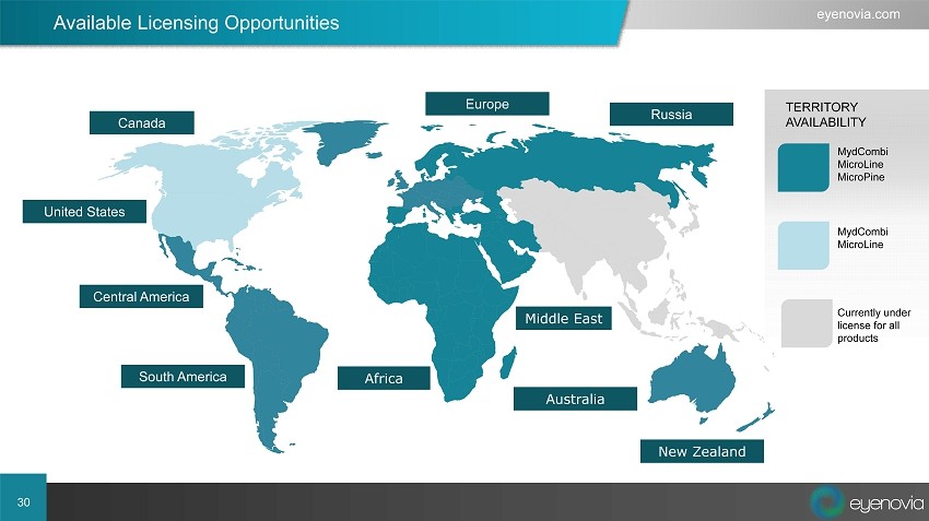 eyenovia.com 30 Available Licensing Opportunities MydCombi MicroLine MydCombi MicroLine MicroPine Canada United States Central America South America Europe Australia New Zealand Africa Russia Middle East Currently under license for all products TERRITORY AVAILABILITY