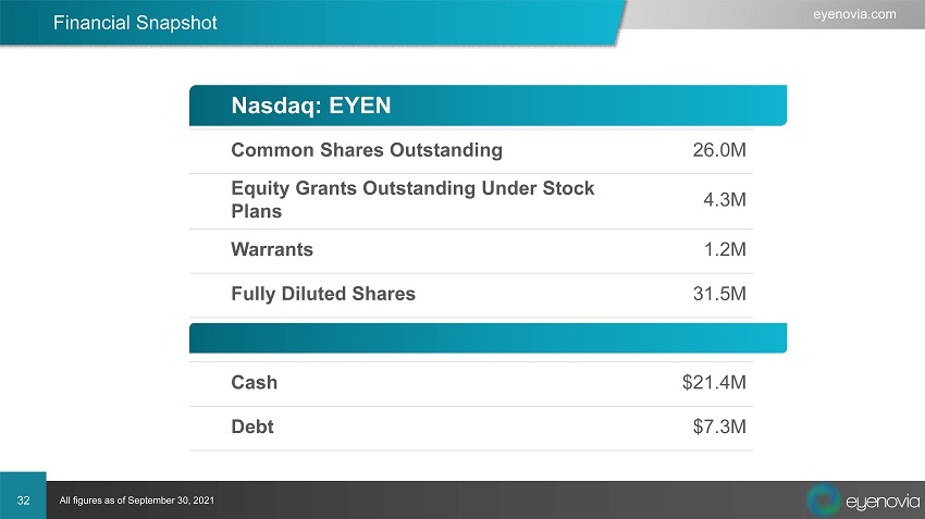 eyenovia.com 31 Intellectual Property Technology that has Multiple Layers of IP, Clinical and Regulatory Protection 13 U.S. Patents Issued 84 . O.U.S. Patents Issued Volume delivered, method of delivery, speed of delivery, data capture Various patent coverage in effect until late 2031 Provisional patents filed to bring protection through 2040