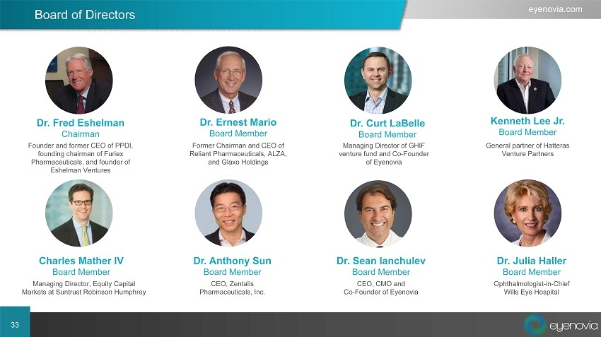 eyenovia.com Board of Directors 33 Dr. Fred Eshelman Chairman Founder and former CEO of PPDI, founding chairman of Furiex Pharmaceuticals, and founder of Eshelman Ventures Dr. Ernest Mario Board Member Former Chairman and CEO of Reliant Pharmaceuticals, ALZA, and Glaxo Holdings Dr. Curt LaBelle Board Member Managing Director of GHIF venture fund and Co - Founder of Eyenovia General partner of Hatteras Venture Partners Kenneth Lee Jr. Board Member Managing Director, Equity Capital Markets at Suntrust Robinson Humphrey Charles Mather IV Board Member CEO, Zentalis Pharmaceuticals, Inc. Dr. Anthony Sun Board Member CEO, CMO and Co - Founder of Eyenovia Dr. Sean Ianchulev Board Member Ophthalmologist - in - Chief Wills Eye Hospital Dr. Julia Haller Board Member