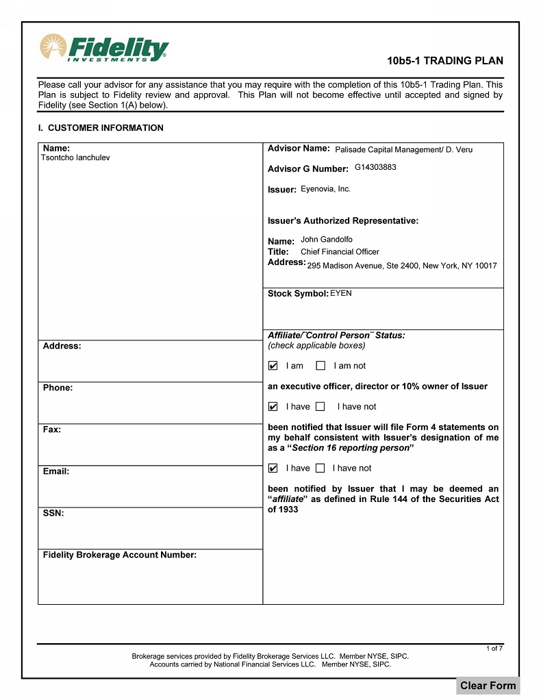 10b5-1 TRADING PLAN 1 of 7 Brokerage services provided by Fidelity Brokerage Services LLC. Member NYSE, SIPC. Accounts carried by National Financial Services LLC. Member NYSE, SIPC. Please call your advisor for any assistance that you may require with the completion of this 10b5-1 Trading Plan. This Plan is subject to Fidelity review and approval. This Plan will not become effective until accepted and signed by Fidelity (see Section 1(A) below). I. CUSTOMER INFORMATION Advisor Name: Advisor G Number: Issuer: Issuer’s Authorized Representative: Name: Title: Address: Stock Symbol: Name: Address: Phone: Fax: Email: SSN: Fidelity Brokerage Account Number: Affiliate/¨Control Person¨ Status: (check applicable boxes) I am I am not an executive officer, director or 10% owner of Issuer I have I have not been notified that Issuer will file Form 4 statements on my behalf consistent with Issuer’s designation of me as a “Section 16 reporting person” I have I have not been notified by Issuer that I may be deemed an “affiliate” as defined in Rule 144 of the Securities Act of 1933 Tsontcho Ianchulev Palisade Capital Management/ D. Veru G14303883 Eyenovia, Inc. John Gandolfo Chief Financial Officer 295 Madison Avenue, Ste 2400, New York, NY 10017 EYEN