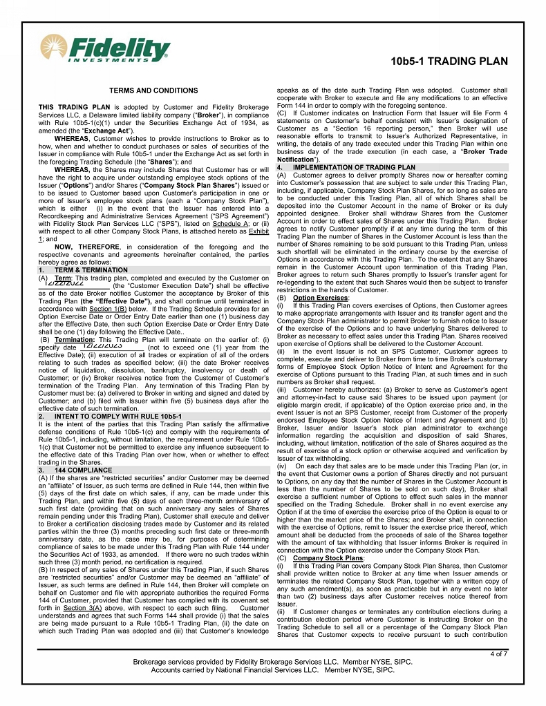 10b5-1 TRADING PLAN 4 of 7 Brokerage services provided by Fidelity Brokerage Services LLC. Member NYSE, SIPC. Accounts carried by National Financial Services LLC. Member NYSE, SIPC. TERMS AND CONDITIONS THIS TRADING PLAN is adopted by Customer and Fidelity Brokerage Services LLC, a Delaware limited liability company (“Broker”), in compliance with Rule 10b5-1(c)(1) under the Securities Exchange Act of 1934, as amended (the “Exchange Act”). WHEREAS, Customer wishes to provide instructions to Broker as to how, when and whether to conduct purchases or sales of securities of the Issuer in compliance with Rule 10b5-1 under the Exchange Act as set forth in the foregoing Trading Schedule (the “Shares”); and WHEREAS, the Shares may include Shares that Customer has or will have the right to acquire under outstanding employee stock options of the Issuer (“Options”) and/or Shares (“Company Stock Plan Shares”) issued or to be issued to Customer based upon Customer’s participation in one or more of Issuer’s employee stock plans (each a “Company Stock Plan”), which is either (i) in the event that the Issuer has entered into a Recordkeeping and Administrative Services Agreement (“SPS Agreement”) with Fidelity Stock Plan Services LLC (“SPS”), listed on Schedule A; or (ii) with respect to all other Company Stock Plans, is attached hereto as Exhibit 1; and NOW, THEREFORE, in consideration of the foregoing and the respective covenants and agreements hereinafter contained, the parties hereby agree as follows: 1. TERM & TERMINATION (A) Term: This trading plan, completed and executed by the Customer on ___________________ (the “Customer Execution Date”) shall be effective as of the date Broker notifies Customer the acceptance by Broker of this Trading Plan (the “Effective Date”), and shall continue until terminated in accordance with Section 1(B) below. If the Trading Schedule provides for an Option Exercise Date or Order Entry Date earlier than one (1) business day after the Effective Date, then such Option Exercise Date or Order Entry Date shall be one (1) day following the Effective Date.. (B) Termination: This Trading Plan will terminate on the earlier of: (i) specify date _________________ (not to exceed one (1) year from the Effective Date); (ii) execution of all trades or expiration of all of the orders relating to such trades as specified below; (iii) the date Broker receives notice of liquidation, dissolution, bankruptcy, insolvency or death of Customer; or (iv) Broker receives notice from the Customer of Customer’s termination of the Trading Plan. Any termination of this Trading Plan by Customer must be: (a) delivered to Broker in writing and signed and dated by Customer; and (b) filed with Issuer within five (5) business days after the effective date of such termination. 2. INTENT TO COMPLY WITH RULE 10b5-1 It is the intent of the parties that this Trading Plan satisfy the affirmative defense conditions of Rule 10b5-1(c) and comply with the requirements of Rule 10b5-1, including, without limitation, the requirement under Rule 10b5- 1(c) that Customer not be permitted to exercise any influence subsequent to the effective date of this Trading Plan over how, when or whether to effect trading in the Shares. 3. 144 COMPLIANCE (A) If the shares are “restricted securities” and/or Customer may be deemed an “affiliate” of Issuer, as such terms are defined in Rule 144, then within five (5) days of the first date on which sales, if any, can be made under this Trading Plan, and within five (5) days of each three-month anniversary of such first date (providing that on such anniversary any sales of Shares remain pending under this Trading Plan), Customer shall execute and deliver to Broker a certification disclosing trades made by Customer and its related parties within the three (3) months preceding such first date or three-month anniversary date, as the case may be, for purposes of determining compliance of sales to be made under this Trading Plan with Rule 144 under the Securities Act of 1933, as amended. If there were no such trades within such three (3) month period, no certification is required. (B) In respect of any sales of Shares under this Trading Plan, if such Shares are ‘restricted securities” and/or Customer may be deemed an “affiliate” of Issuer, as such terms are defined in Rule 144, then Broker will complete on behalf on Customer and file with appropriate authorities the required Forms 144 of Customer, provided that Customer has complied with its covenant set forth in Section 3(A) above, with respect to each such filing. Customer understands and agrees that such Forms 144 shall provide (i) that the sales are being made pursuant to a Rule 10b5-1 Trading Plan, (ii) the date on which such Trading Plan was adopted and (iii) that Customer’s knowledge speaks as of the date such Trading Plan was adopted. Customer shall cooperate with Broker to execute and file any modifications to an effective Form 144 in order to comply with the foregoing sentence. (C) If Customer indicates on Instruction Form that Issuer will file Form 4 statements on Customer’s behalf consistent with Issuer’s designation of Customer as a “Section 16 reporting person,” then Broker will use reasonable efforts to transmit to Issuer’s Authorized Representative, in writing, the details of any trade executed under this Trading Plan within one business day of the trade execution (in each case, a “Broker Trade Notification”). 4. IMPLEMENTATION OF TRADING PLAN (A) Customer agrees to deliver promptly Shares now or hereafter coming into Customer’s possession that are subject to sale under this Trading Plan, including, if applicable, Company Stock Plan Shares, for so long as sales are to be conducted under this Trading Plan, all of which Shares shall be deposited into the Customer Account in the name of Broker or its duly appointed designee. Broker shall withdraw Shar