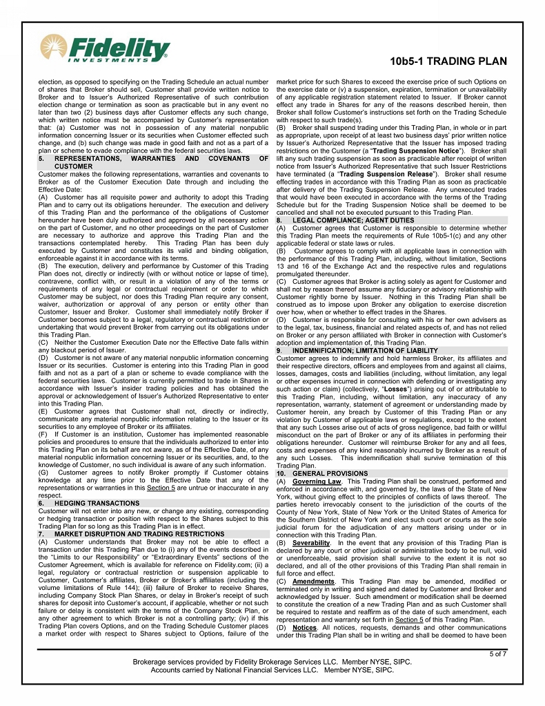 10b5-1 TRADING PLAN 5 of 7 Brokerage services provided by Fidelity Brokerage Services LLC. Member NYSE, SIPC. Accounts carried by National Financial Services LLC. Member NYSE, SIPC. election, as opposed to specifying on the Trading Schedule an actual number of shares that Broker should sell, Customer shall provide written notice to Broker and to Issuer’s Authorized Representative of such contribution election change or termination as soon as practicable but in any event no later than two (2) business days after Customer effects any such change, which written notice must be accompanied by Customer’s representation that: (a) Customer was not in possession of any material nonpublic information concerning Issuer or its securities when Customer effected such change, and (b) such change was made in good faith and not as a part of a plan or scheme to evade compliance with the federal securities laws. 5. REPRESENTATIONS, WARRANTIES AND COVENANTS OF CUSTOMER Customer makes the following representations, warranties and covenants to Broker as of the Customer Execution Date through and including the Effective Date: (A) Customer has all requisite power and authority to adopt this Trading Plan and to carry out its obligations hereunder. The execution and delivery of this Trading Plan and the performance of the obligations of Customer hereunder have been duly authorized and approved by all necessary action on the part of Customer, and no other proceedings on the part of Customer are necessary to authorize and approve this Trading Plan and the transactions contemplated hereby. This Trading Plan has been duly executed by Customer and constitutes its valid and binding obligation, enforceable against it in accordance with its terms. (B) The execution, delivery and performance by Customer of this Trading Plan does not, directly or indirectly (with or without notice or lapse of time), contravene, conflict with, or result in a violation of any of the terms or requirements of any legal or contractual requirement or order to which Customer may be subject, nor does this Trading Plan require any consent, waiver, authorization or approval of any person or entity other than Customer, Issuer and Broker. Customer shall immediately notify Broker if Customer becomes subject to a legal, regulatory or contractual restriction or undertaking that would prevent Broker from carrying out its obligations under this Trading Plan. (C) Neither the Customer Execution Date nor the Effective Date falls within any blackout period of Issuer. (D) Customer is not aware of any material nonpublic information concerning Issuer or its securities. Customer is entering into this Trading Plan in good faith and not as a part of a plan or scheme to evade compliance with the federal securities laws. Customer is currently permitted to trade in Shares in accordance with Issuer’s insider trading policies and has obtained the approval or acknowledgement of Issuer’s Authorized Representative to enter into this Trading Plan. (E) Customer agrees that Customer shall not, directly or indirectly, communicate any material nonpublic information relating to the Issuer or its securities to any employee of Broker or its affiliates. (F) If Customer is an institution, Customer has implemented reasonable policies and procedures to ensure that the individuals authorized to enter into this Trading Plan on its behalf are not aware, as of the Effective Date, of any material nonpublic information concerning Issuer or its securities, and, to the knowledge of Customer, no such individual is aware of any such information. (G) Customer agrees to notify Broker promptly if Customer obtains knowledge at any time prior to the Effective Date that any of the representations or warranties in this Section 5 are untrue or inaccurate in any respect. 6. HEDGING TRANSACTIONS Customer will not enter into any new, or change any existing, corresponding or hedging transaction or position with respect to the Shares subject to this Trading Plan for so long as this Trading Plan is in effect. 7. MARKET DISRUPTION AND TRADING RESTRICTIONS (A) Customer understands that Broker may not be able to effect a transaction under this Trading Plan due to (i) any of the events described in the “Limits to our Responsibility” or “Extraordinary Events” sections of the Customer Agreement, which is available for reference on Fidelity.com; (ii) a legal, regulatory or contractual restriction or suspension applicable to Customer, Customer’s affiliates, Broker or Broker’s affiliates (including the volume limitations of Rule 144); (iii) failure of Broker to receive Shares, including Company Stock Plan Shares, or delay in Broker’s receipt of such shares for deposit into Customer’s account, if applicable, whether or not such failure or delay is consistent with the terms of the Company Stock Plan, or any other agreement to which Broker is not a controlling party; (iv) if this Trading Plan covers Options, and on the Trading Schedule Customer places a market order with respect to Shares subject to Options, failure of the market price for such Shares to exceed the exercise price of such Options on the exercise date or (v) a suspension, expiration, termination or unavailability of any applicable registration statement related to Issuer. If Broker cannot effect any trade in Shares for any of the reasons described herein, then Broker shall follow Customer’s instructions set forth on the Trading Schedule with respect to such trade(s). (B) Broker shall suspend trading under this Trading Plan, in whole or in part as appropriate, upon receipt of at least two business days’ prior written notice by Issuer’s Authorized Representative that the Issuer has imposed trading restrictions on the Customer (a “Trading Suspension Notice”). Broker shall lift any such trading suspension as soon as practicable after receipt of written notice from Issuer’s Authorized Representative that such Issuer Restricti