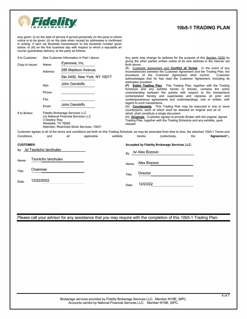 duly given: (i) on the date of service if served personally on the party to whom notice is to be given; (ii) on the date when receipt by addressee is confirmed in writing, if sent via facsimile transmission to the facsimile number given below; or (iii) on the first business day with respect to which a reputable air courier guarantees delivery; to the party as follows: If to Customer: See Customer Information in Part I above. Copy to Issuer: Name: ____________________ Address: ____________________ ____________________ Attn: ____________________ Phone: ____________________ Fax: ____________________ Email: ____________________ Eyenovia, Inc. 295 Madison Avenue, Ste 2400, New York, NY 10017 John Gandolfo John Gandolfo If to Broker: Fidelity Brokerage Services LLC c/o National Financial Services LLC 2 Destiny Way Westlake, TX 76262 Attention: Restricted Stock Services, 10b51 10b5-1 TRADING PLAN Any party may change its address for the purpose of this Section 10(D) by giving the other parties written notice of its new address in the manner set forth above. (E) Customer Agreement and Conflict of Terms. In the event of any inconsistencies between the Customer Agreement and the Trading Plan, the provisions of the Customer Agreement shall control. Customer acknowledges that he has read the Customer Agreement, including its arbitration provision. (F) Entire Trading Plan. This Trading Plan, together with the Trading Schedule and any exhibits hereto or thereto, contains the entire understanding between the parties with respect to the transactions contemplated hereby and supersedes and replaces all prior and contemporaneous agreements and understandings, oral or written, with regard to such transactions. (G) Counterparts. This Trading Plan may be executed in one or more counterparts, each of which shall be deemed an original and all of which shall constitute a single document. (H) Originals. Customer agrees to provide Broker with the original, signed Trading Plan, together with the Trading Schedule and any exhibits, upon request. Customer agrees to all of the terms and conditions set forth on this Trading Schedule, as may be amended from time to time, the attached 10b5-1 Terms and Conditions, and all applicable exhibits hereto (collectively, the “Agreement”). CUSTOMER: By: ______ Name: _______________________________ Title: _______________________________ Date: _______________________________ Accepted by Fidelity Brokerage Services LLC: By: ______ Name: ________________________________ Title: ________________________________ Date: ________________________________ Please call your advisor for any assistance that you may require with the completion of this 10b5-1 Trading Plan. /s/ Tsontcho Ianchulev 12/22/2022 12/23/22 /s/ Alex Bozovic 6 of 7 Brokerage services provided by Fidelity Brokerage Services LLC. Member NYSE, SIPC. Accounts carried by National Financial Services LLC. Member NYSE, SIPC.