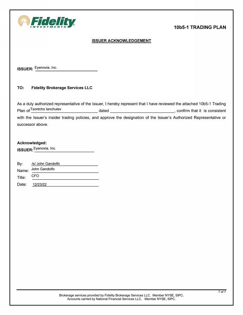 10b5-1 TRADING PLAN 7 of 7 Brokerage services provided by Fidelity Brokerage Services LLC. Member NYSE, SIPC. Accounts carried by National Financial Services LLC. Member NYSE, SIPC. ISSUER ACKNOWLEDGEMENT ISSUER: Eyenovia, Inc. TO: Fidelity Brokerage Services LLC As a duly authorized representative of the Issuer, I hereby represent that I have reviewed the attached 10b5-1 Trading Plan of Tsontcho Ianchulev ______________________________ dated _____________________________, confirm that it is consistent with the Issuer’s insider trading policies, and approve the designation of the Issuer’s Authorized Representative or successor above. Acknowledged: ISSUER: ___________________________ By: ______________________________ Name: ______________________________ Title: ______________________________ Date: ______________________________ Eyenovia, Inc. Tsontcho Ianchulev /s/ John Gandolfo John Gandolfo CFO 12/23/22