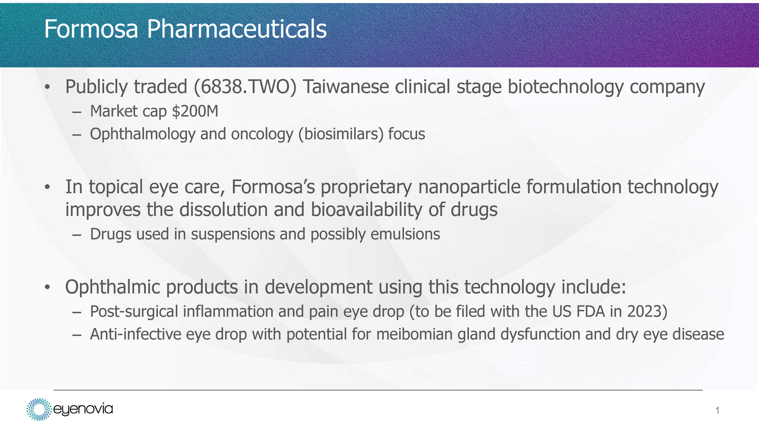 • Publicly traded (6838.TWO) Taiwanese clinical stage biotechnology company – Market cap $200M – Ophthalmology and oncology (biosimilars) focus • In topical eye care, Formosa’s proprietary nanoparticle formulation technology improves the dissolution and bioavailability of drugs – Drugs used in suspensions and possibly emulsions • Ophthalmic products in development using this technology include: – Post - surgical inflammation and pain eye drop (to be filed with the US FDA in 2023) – Anti - infective eye drop with potential for meibomian gland dysfunction and dry eye disease 1 Formosa Pharmaceuticals