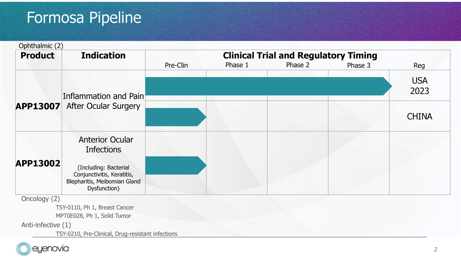 Formosa Pipeline Product Indication Pre - Clin Clinical Trial and Regulatory Timing Phase 1 Phase 2 Phase 3 Reg APP13007 Inflammation and Pain After Ocular Surgery USA 202 3 CHINA A PP 13 0 02 Anterior Ocular Infections (Including: Bacterial Conjunctivitis, Keratitis, Blepharitis, Meibomian Gland Dysfunction) Oncology (2) TSY - 0110, Ph 1, Breast Cancer MPT0E028, Ph 1, Solid Tumor Anti - infective (1) TSY - 0210, Pre - Clinical, Drug - resistant infections Ophthalmic (2) 2