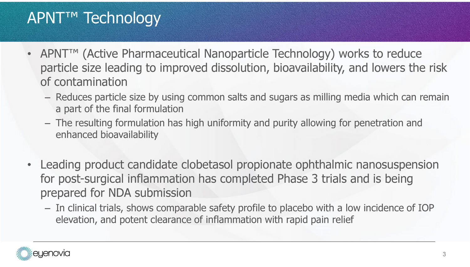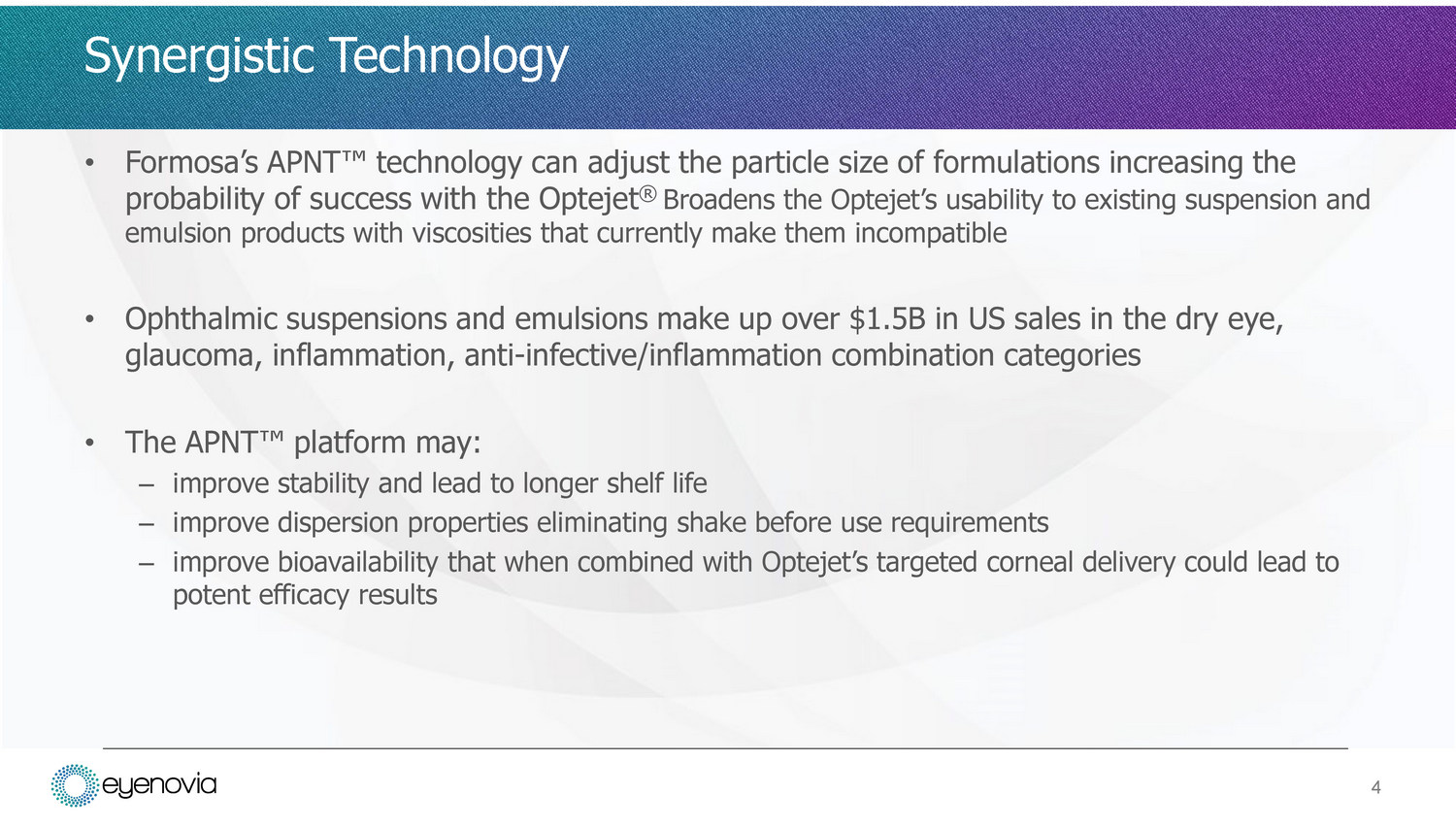 • APNT Œ (Active Pharmaceutical Nanoparticle Technology) works to reduce particle size leading to improved dissolution, bioavailability, and lowers the risk of contamination – Reduces particle size by using common salts and sugars as milling media which can remain a part of the final formulation – The resulting formulation has high uniformity and purity allowing for penetration and enhanced bioavailability • Leading product candidate clobetasol propionate ophthalmic nanosuspension for post - surgical inflammation has completed Phase 3 trials and is being prepared for NDA submission – In clinical trials, shows comparable safety profile to placebo with a low incidence of IOP elevation, and potent clearance of inflammation with rapid pain relief 3 APNT Œ Technology