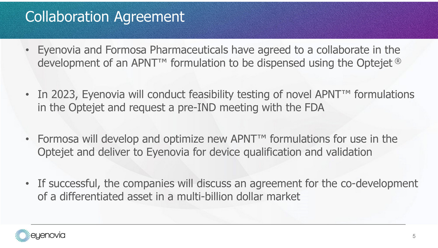 • Formosa’s APNT Œ technology can adjust the particle size of formulations increasing the probability of success with the Optejet ® Broadens the Optejet’s usability to existing suspension and emulsion products with viscosities that currently make them incompatible • Ophthalmic suspensions and emulsions make up over $1.5B in US sales in the dry eye, glaucoma, inflammation, anti - infective/inflammation combination categories • The APNT Œ platform may: – improve stability and lead to longer shelf life – improve dispersion properties eliminating shake before use requirements – improve bioavailability that when combined with Optejet’s targeted corneal delivery could lead to potent efficacy results 4 Synergistic Technology