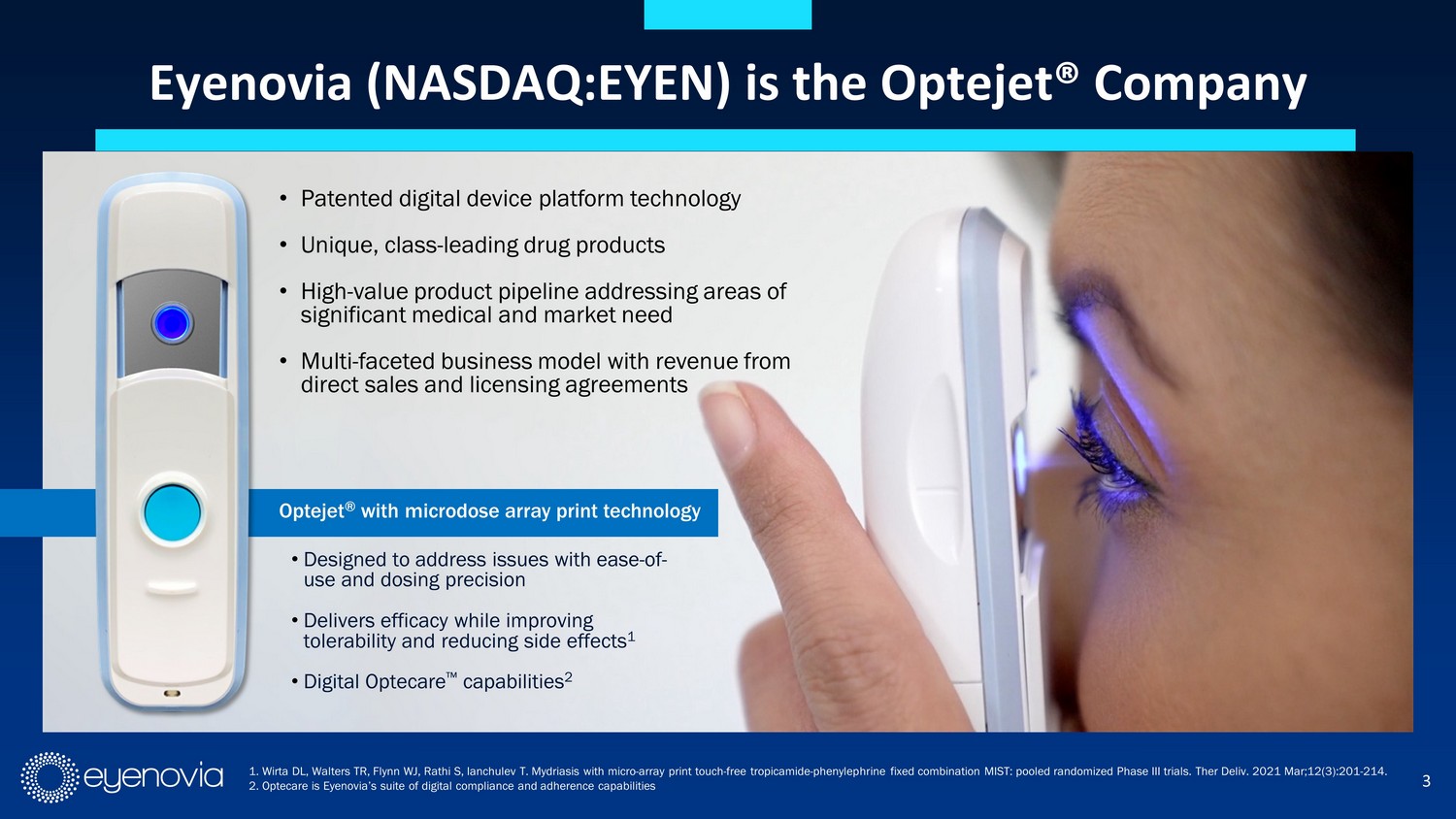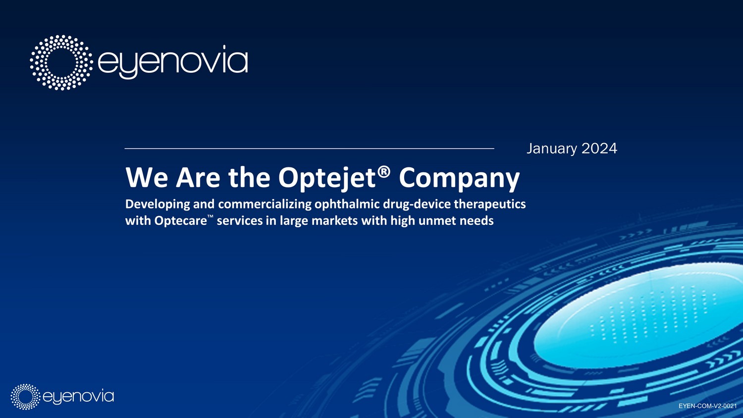 January 2024 We Are the Optejet® Company Developing and commercializing ophthalmic drug - device therapeutics with Optecare Ρ services in large markets with high unmet needs EYEN - COM - V2 - 0021