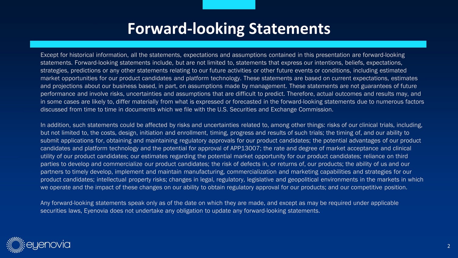 Forward - looking Statements Except for historical information, all the statements, expectations and assumptions contained in this presentation are forwar d - l ooking statements. Forward - looking statements include, but are not limited to, statements that express our intentions, beliefs, expecta tions, strategies, predictions or any other statements relating to our future activities or other future events or conditions, inclu din g estimated market opportunities for our product candidates and platform technology. These statements are based on current expectations, est imates and projections about our business based, in part, on assumptions made by management. These statements are not guarantees of fut ure performance and involve risks, uncertainties and assumptions that are difficult to predict. Therefore, actual outcomes and re sul ts may, and in some cases are likely to, differ materially from what is expressed or forecasted in the forward - looking statements due to num erous factors discussed from time to time in documents which we file with the U.S. Securities and Exchange Commission. In addition, such statements could be affected by risks and uncertainties related to, among other things: risks of our clinic al trials, including, but not limited to, the costs, design, initiation and enrollment, timing, progress and results of such trials; the timing of, an d our ability to submit applications for, obtaining and maintaining regulatory approvals for our product candidates; the potential advantages of our product candidates and platform technology and the potential for approval of APP13007 ; the rate and degree of market acceptance and clinical utility of our product candidates; our estimates regarding the potential market opportunity for our product candidates; relia nce on third parties to develop and commercialize our product candidates; the risk of defects in, or returns of, our products; the ability of us and our partners to timely develop, implement and maintain manufacturing, commercialization and marketing capabilities and strategies fo r our product candidates; intellectual property risks; changes in legal, regulatory, legislative and geopolitical environments in t he markets in which we operate and the impact of these changes on our ability to obtain regulatory approval for our products; and our competitive po sition. Any forward - looking statements speak only as of the date on which they are made, and except as may be required under applicable securities laws, Eyenovia does not undertake any obligation to update any forward - looking statements. 2