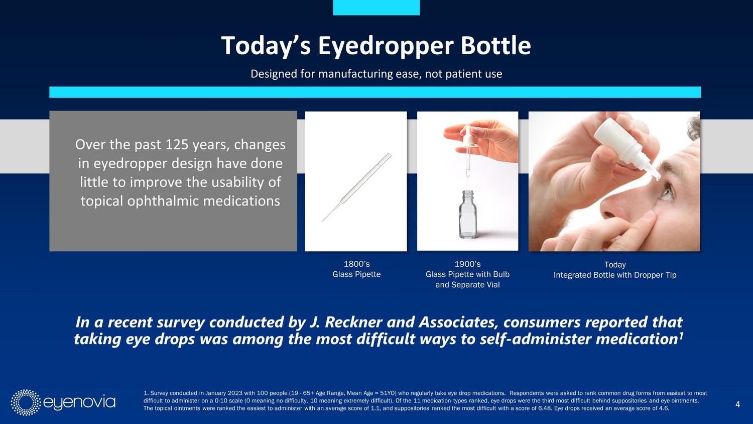4 Today’s Eyedropper Bottle Designed for manufacturing ease, not patient use Over the past 125 years, changes in eyedropper design have done little to improve the usability of topical ophthalmic medications 1800’s Glass Pipette 1900’s Glass Pipette with Bulb and Separate Vial Today Integrated Bottle with Dropper Tip 1. S urvey conducted in January 2023 with 100 people (19 - 65+ Age Range, Mean Age = 51YO) who regularly take eye drop medications. Respondents were asked to rank common drug forms from easiest to most difficult to administer on a 0 - 10 scale (0 meaning no difficulty, 10 meaning extremely difficult). Of the 11 medication types ra nked, eye drops were the third most difficult behind suppositories and eye ointments. The topical ointments were ranked the easiest to administer with an average score of 1.1, and suppositories ranked the most d iff icult with a score of 6.48. Eye drops received an average score of 4.6. In a recent survey conducted by J. Reckner and Associates, consumers reported that taking eye drops was among the most difficult ways to self - administer medication 1