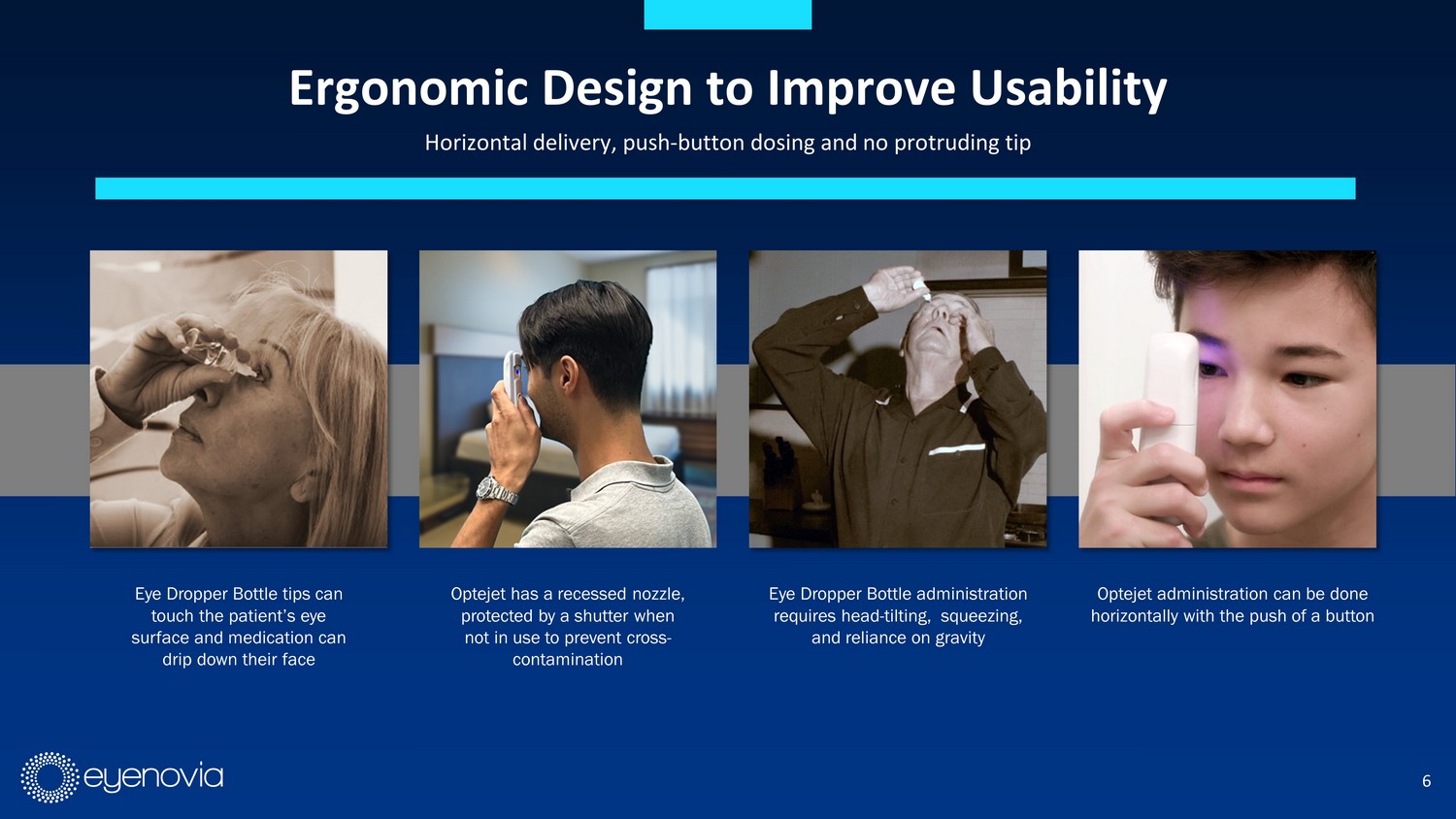5 Introducing the Optejet ® Optejet® with replaceable drug cartridge Spray nozzle with 109 laser - drilled ports Shutter Activation button Ergonomic design Proprietary, pre - filled drug cartridge manufactured by Eyenovia Optejet is a drug - device combination product manufactured with a sterile - filled, replaceable drug cartridge and equipped with Optecare Œ (connected care) capabilities