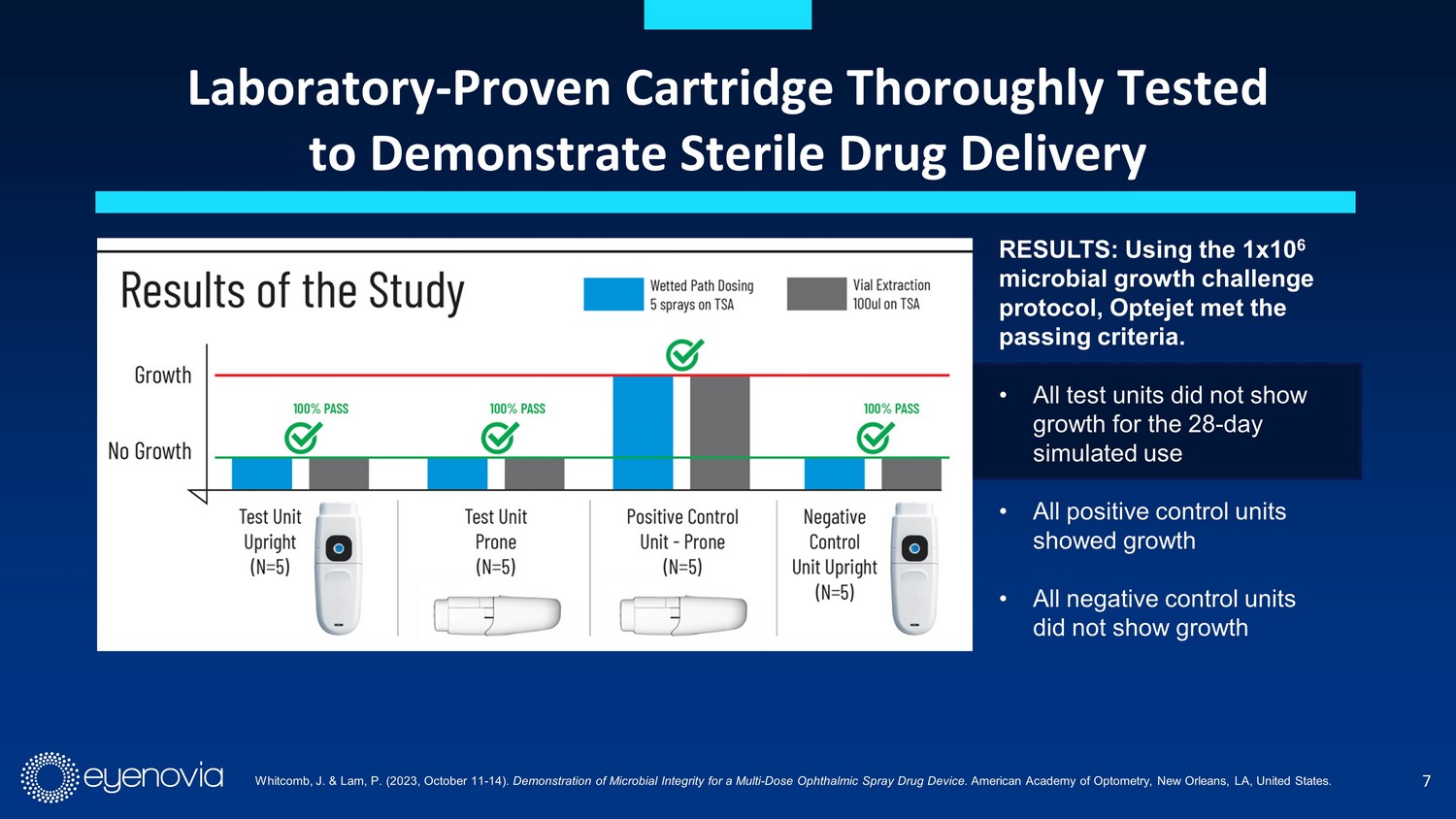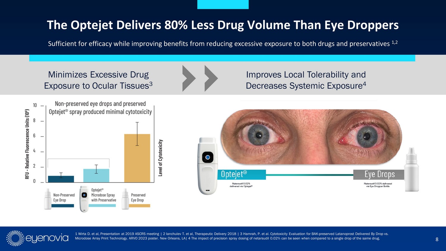 7 Laboratory - Proven Cartridge Thoroughly Tested to Demonstrate Sterile Drug Delivery RESULTS: Using the 1x10 6 microbial growth challenge protocol, Optejet met the passing criteria. • All test units did not show growth for the 28 - day simulated use • All positive control units showed growth • All negative control units did not show growth Whitcomb, J. & Lam, P. (2023, October 11 - 14). Demonstration of Microbial Integrity for a Multi - Dose Ophthalmic Spray Drug Device. American Academy of Optometry, New Orleans, LA, United States.