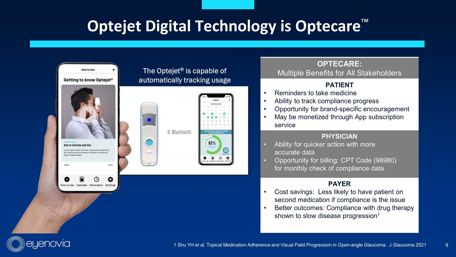 9 Optejet Digital Technology is Optecare Ρ The Optejet ® is capable of automatically tracking usage OPTECARE: Multiple Benefits for All Stakeholders PATIENT • Reminders to take medicine • Ability to track compliance progress • Opportunity for brand - specific encouragement • May be monetized through App subscription service PHYSICIAN • Ability for quicker action with more accurate data • Opportunity for billing: CPT Code (98980) for monthly check of compliance data PAYER • Cost savings: Less likely to have patient on second medication if compliance is the issue • Better outcomes: Compliance with drug therapy shown to slow disease progression 1 1 Shu YH et al. Topical Medication Adherence and Visual Field Progression in Open - angle Glaucoma. J Glaucoma 2021