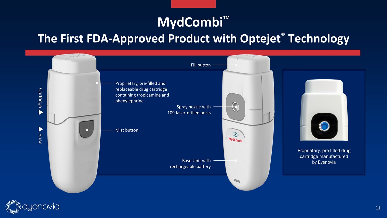 11 Spray nozzle with 109 laser - drilled ports Mist button Proprietary, pre - filled and replaceable drug cartridge containing tropicamide and phenylephrine Fill button Base Unit with rechargeable battery Cartridge Base Proprietary, pre - filled drug cartridge manufactured by Eyenovia MydCombi Ρ The First FDA - Approved Product with Optejet ® Technology