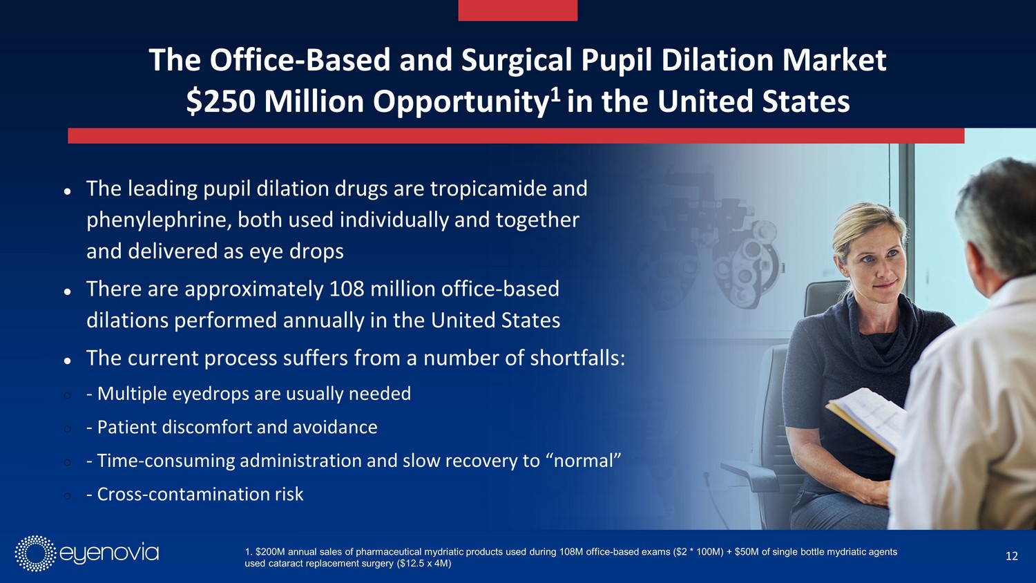 12 The Office - Based and Surgical Pupil Dilation Market $250 Million Opportunity 1 in the United States 1. $200M annual sales of pharmaceutical mydriatic products used during 108M office - based exams ($2 * 100M) + $50M of single bott le mydriatic agents used cataract replacement surgery ($12.5 x 4M) ● The leading pupil dilation drugs are tropicamide and phenylephrine, both used individually and together and delivered as eye drops ● There are approximately 108 million office - based dilations performed annually in the United States ● The current process suffers from a number of shortfalls: ○ - Multiple eyedrops are usually needed ○ - Patient discomfort and avoidance ○ - Time - consuming administration and slow recovery to “normal” ○ - Cross - contamination risk