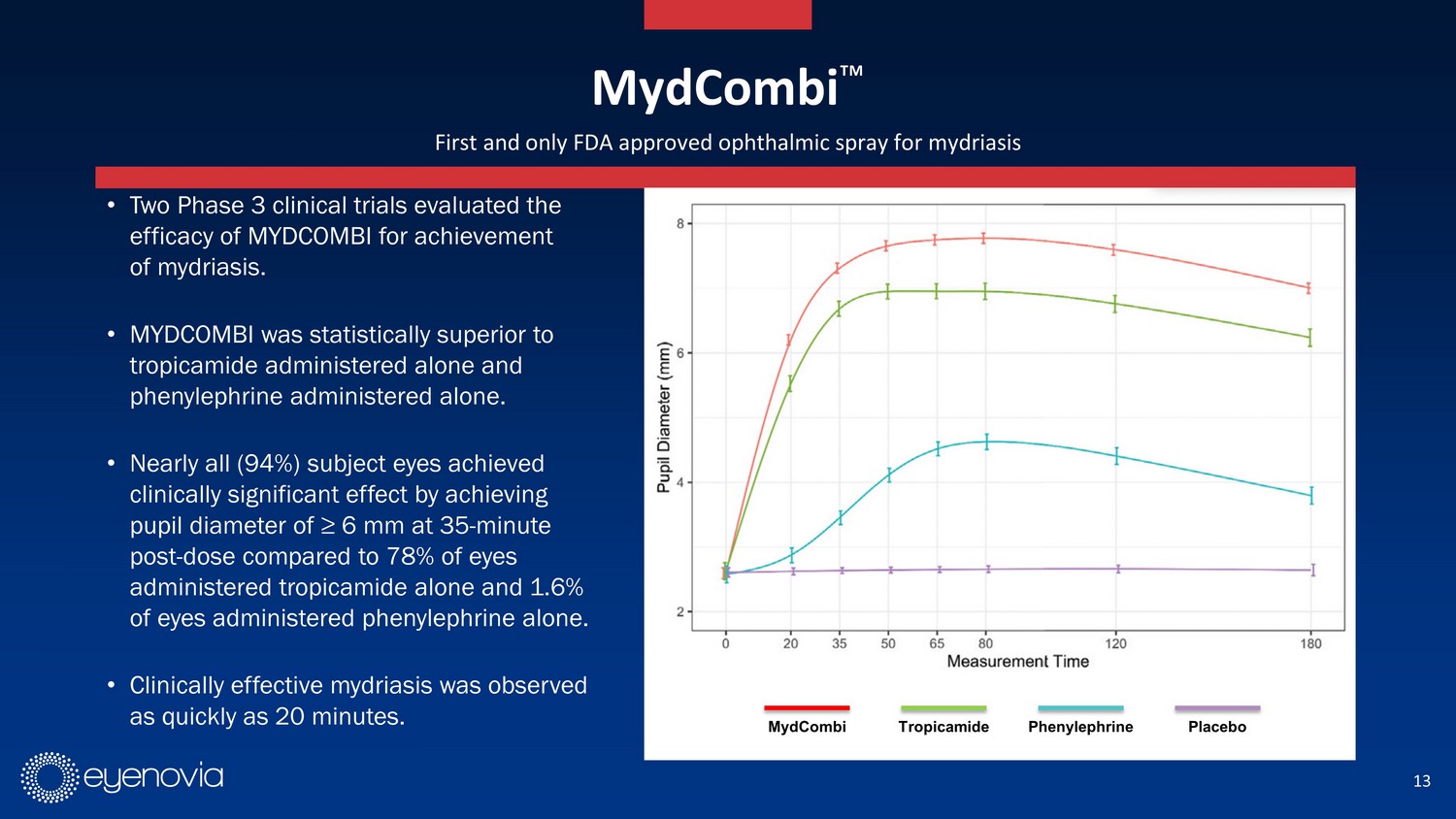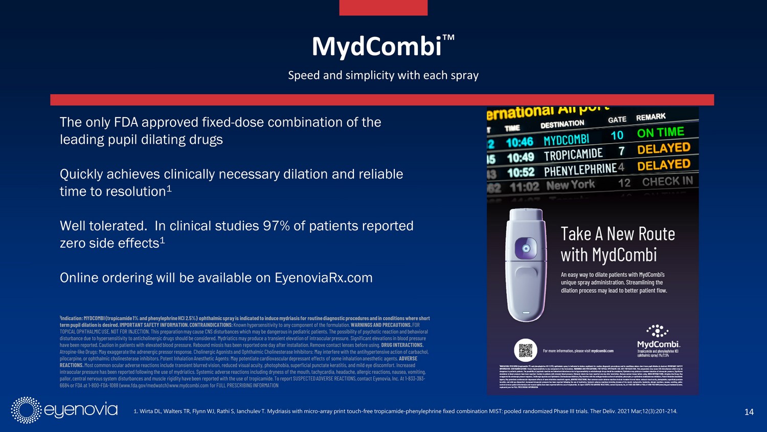 14 MydCombi Ρ Speed and simplicity with each spray 1 Indication: MYDCOMBI (tropicamide 1% and phenylephrine HCl 2.5%) ophthalmic spray is indicated to induce mydriasis for routin e d iagnostic procedures and in conditions where short term pupil dilation is desired. IMPORTANT SAFETY INFORMATION. CONTRAINDICATIONS: Known hypersensitivity to any component of the formulation. WARNINGS AND PRECAUTIONS. FOR TOPICAL OPHTHALMIC USE. NOT FOR INJECTION. This preparation may cause CNS disturbances which may be dangerous in pediatric pa tie nts. The possibility of psychotic reaction and behavioral disturbance due to hypersensitivity to anticholinergic drugs should be considered. Mydriatics may produce a transient elevati on of intraocular pressure. Significant elevations in blood pressure have been reported. Caution in patients with elevated blood pressure. Rebound miosis has been reported one day after installa tio n. Remove contact lenses before using. DRUG INTERACTIONS. Atropine - like Drugs: May exaggerate the adrenergic pressor response. Cholinergic Agonists and Ophthalmic Cholinesterase Inhibito rs: May interfere with the antihypertensive action of carbachol, pilocarpine, or ophthalmic cholinesterase inhibitors. Potent Inhalation Anesthetic Agents: May potentiate cardiovascular depr ess ant effects of some inhalation anesthetic agents. ADVERSE REACTIONS. Most common ocular adverse reactions include transient blurred vision, reduced visual acuity, photophobia, superficial puncta te keratitis, and mild eye discomfort. Increased intraocular pressure has been reported following the use of mydriatics. Systemic adverse reactions including dryness of the m out h, tachycardia, headache, allergic reactions, nausea, vomiting, pallor, central nervous system disturbances and muscle rigidity have been reported with the use of tropicamide. To report SUS PEC TED ADVERSE REACTIONS, contact Eyenovia, Inc. At 1 - 833 - 393 - 6684 or FDA at 1 - 800 - FDA - 1088 ( www.fda.gov / medwatch ) www.mydcombi.com for FULL PRESCRIBING INFORMATION The only FDA approved fixed - dose combination of the leading pupil dilating drugs Quickly achieves clinically necessary dilation and reliable time to resolution 1 Well tolerated. In clinical studies 97% of patients reported zero side effects 1 Online ordering will be available on EyenoviaRx.com 1. Wirta DL, Walters TR, Flynn WJ, Rathi S, Ianchulev T. Mydriasis with micro - array print touch - free tropicamide - phenylephrine fixed combination MIST: pooled randomized Phase III tr ials. Ther Deliv . 2021 Mar;12(3):201 - 214.
