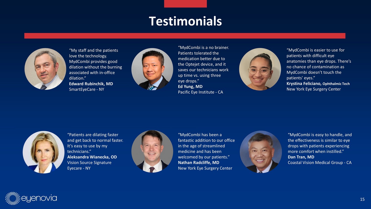 15 Testimonials “My staff and the patients love the technology. MydCombi provides good dilation without the burning associated with in - office dilation.” Edward Rubinchik , MD SmartEyeCare - NY “MydCombi is a no brainer. Patients tolerated the medication better due to the Optejet device, and it saves our technicians work up time vs. using three eye drops.” Ed Yung, MD Pacific Eye Institute - CA “MydCombi is easier to use for patients with difficult eye anatomies than eye drops. There’s no chance of contamination as MydCombi doesn’t touch the patients' eyes.” Krystina Feliciano, Ophthalmic Tech New York Eye Surgery Center “Patients are dilating faster and get back to normal faster. It’s easy to use by my technicians.” Aleksandra Wianecka , OD Vision Source Signature Eyecare - NY “MydCombi has been a fantastic addition to our office in the age of streamlined medicine and has been welcomed by our patients.” Nathan Radcliffe, MD New York Eye Surgery Center “MydCombi is easy to handle, and the effectiveness is similar to eye drops with patients experiencing more comfort when instilled.” Dan Tran, MD Coastal Vision Medical Group - CA