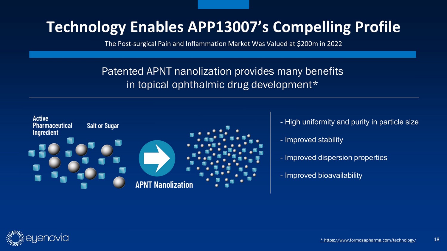 17 APP13007 (Clobetasol Propionate Nanosuspension 0.05%, BID) An Important Advancement in Ocular Post - Surgical Pain and Inflammation Control FDA PDUFA date March 2024 • Short and mid - term revenue opportunity ($700 M market) 1 • Synergistic commercialization with MydCombi’s sales force 2024 Post - ocular surgery treatment 2027 • Potential acute dry eye product in the Optejet ($236 M market) 2 Dry eye treatment 1. IQVIA Estimates of Ophthalmic Topical Steroid and Steroid Combinations Market 2023 2. Eyenovia Estimates chronic dry eye is 90% and acute is 10% of total dry eye market of $2.36B (North America Dry Eye Syndro me Market – Industry Trends and Forecast to 2030) Data Bridge Market Research. Available at: https://www.databridgemarketresearch.com/reports/north - america - dry - eye - syndrome - market#:~:text=Data%20Bridge%20Mar ket%20Research%20analyzes,indicates%20that%20the%20market%20value.