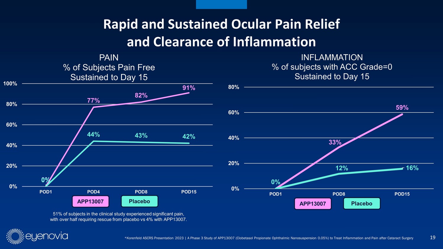 18 Technology Enables APP13007’s Compelling Profile The Post - surgical Pain and Inflammation Market Was Valued at $200m in 2022 - High uniformity and purity in particle size - Improved stability - Improved dispersion properties - Improved bioavailability Patented APNT nanolization provides many benefits in topical ophthalmic drug development* * https://www.formosapharma.com/technology/