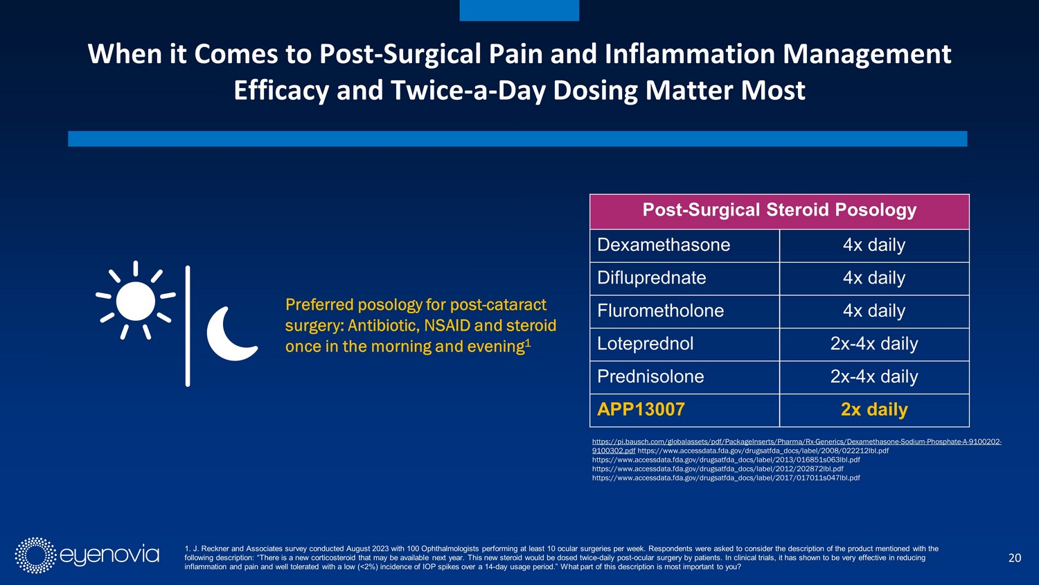 20 When it Comes to Post - Surgical Pain and Inflammation Management Efficacy and Twice - a - Day Dosing Matter Most 1. J. Reckner and Associates survey conducted August 2023 with 100 Ophthalmologists performing at least 10 ocular surgeries p er week. Respondents were asked to consider the description of the product mentioned with the following description: “There is a new corticosteroid that may be available next year. This new steroid would be dosed twice - dai ly post - ocular surgery by patients. In clinical trials, it has shown to be very effective in reducing inflammation and pain and well tolerated with a low (<2%) incidence of IOP spikes over a 14 - day usage period.” What part of this description is most important to you? Preferred posology for post - cataract surgery: Antibiotic, NSAID and steroid once in the morning and evening 1 Post - Surgical Steroid Posology Dexamethasone 4x daily Difluprednate 4x daily Flurometholone 4x daily Loteprednol 2x - 4x daily Prednisolone 2x - 4x daily APP13007 2x daily https://pi.bausch.com/globalassets/pdf/PackageInserts/Pharma/Rx - Generics/Dexamethasone - Sodium - Phosphate - A - 9100202 - 9100302.pdf https:// www.accessdata.fda.gov / drugsatfda_docs /label/2008/022212lbl.pdf https:// www.accessdata.fda.gov / drugsatfda_docs /label/2013/016851s063lbl.pdf https:// www.accessdata.fda.gov / drugsatfda_docs /label/2012/202872lbl.pdf https:// www.accessdata.fda.gov / drugsatfda_docs /label/2017/017011s047lbl.pdf