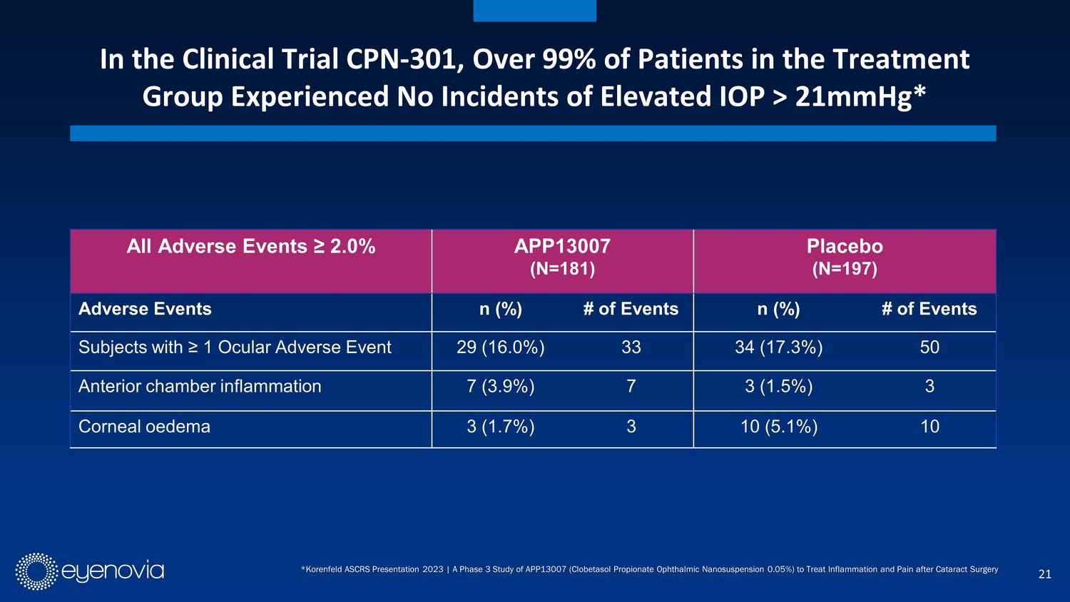 19 * Korenfeld ASCRS Presentation 2023 | A Phase 3 Study of APP13007 (Clobetasol Propionate Ophthalmic Nanosuspension 0.05%) to Treat Inflammation and Pain after Cata rac t Surgery 0% 33% 59% 0% 12% 16% 0% 20% 40% 60% 80% POD1 POD8 POD15 INFLAMMATION % of subjects with ACC Grade=0 Sustained to Day 15 51% of subjects in the clinical study experienced significant pain, with over half requiring rescue from placebo vs 4% with APP13007. 0% 77% 82% 91% 0% 44% 43% 42% 0% 20% 40% 60% 80% 100% POD1 POD4 POD8 POD15 PAIN % of Subjects Pain Free Sustained to Day 15 APP13007 Placebo APP13007 Placebo Rapid and Sustained Ocular Pain Relief and Clearance of Inflammation