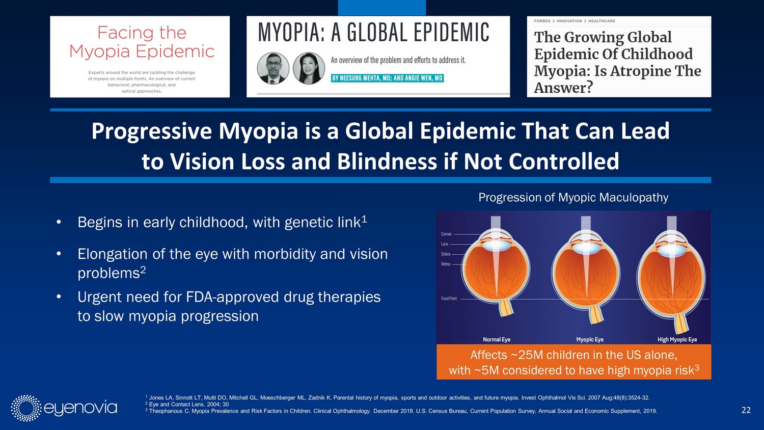 22 • Begins in early childhood, with genetic link 1 • Elongation of the eye with morbidity and vision problems 2 • Urgent need for FDA - approved drug therapies to slow myopia progression Affects ~25M children in the US alone, with ~5M considered to have high myopia risk 3 1 Jones LA, Sinnott LT, Mutti DO, Mitchell GL, Moeschberger ML, Zadnik K. Parental history of myopia, sports and outdoor activities, and future myopia. Invest Ophthalmol Vis Sci. 2007 Aug;48(8):3524 - 32. 2 Eye and Contact Lens. 2004; 30 3 Theophanous C. Myopia Prevalence and Risk Factors in Children. Clinical Ophthalmology. December 2018. U.S. Census Bureau, Cur re nt Population Survey, Annual Social and Economic Supplement, 2019. Progressive Myopia is a Global Epidemic That Can Lead to Vision Loss and Blindness if Not Controlled Progression of Myopic Maculopathy