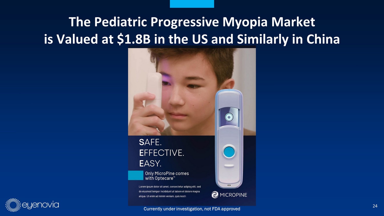 24 The Pediatric Progressive Myopia Market is Valued at $1.8B in the US and Similarly in China Currently under investigation, not FDA approved