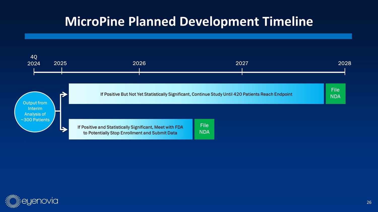 25 Optecare Ρ Designed to Improve Treatment Adherence • Precision - dosed atropine spray developed specifically for children • Easy, daily use by children 1 • Lower drug volume exposure to enhance comfort and minimize systemic exposure • Can communicate with smart devices to track treatment adherence and provide family reminders • Compliance data shows promise compared with historical treatments 1 Data on file with Eyenovia. 2 Naito 2018: Naito T, Yoshikawa K, Namiguchi K, Mizoue S, Shiraishi A, et al. (2018) Comparison of success rates in eye drop instillation between sitting position and supine position. PLOS ONE 13 (9): e0204363. Patel 1995: Patel SC, Spaeth GL. Compliance in patients prescribed eyedrops for glaucoma. Ophthalmic Surg. 1995 May - Ju n;26(3):233 - 6. Winfield, 1990: Winfield AJ, Jessiman D, Williams A, Esakowitz L. A study of the causes of non - compliance by patients prescribed eyedrops. Br J Ophthalmol . 1990 Aug;74(8):477 - 80. 3. Matsui, 1997: Matsui DM. Drug compliance in pediatrics. Clinical and research issues. Pediatr Clin North Am. 1997 Feb;44(1):1 - 14. 0% 10% 20% 30% 40% 50% 60% 70% 80% 90% 100% 0 5 10 15 20 25 Six - Month Daily Treatment Compliance 28 Children Age 6 – 13 YO 1 Subject number Correctly Administered Doses / Total Potential Doses Average of compliance rates from published ophthalmic studies 2 Average of compliance rates from published pediatric studies 3