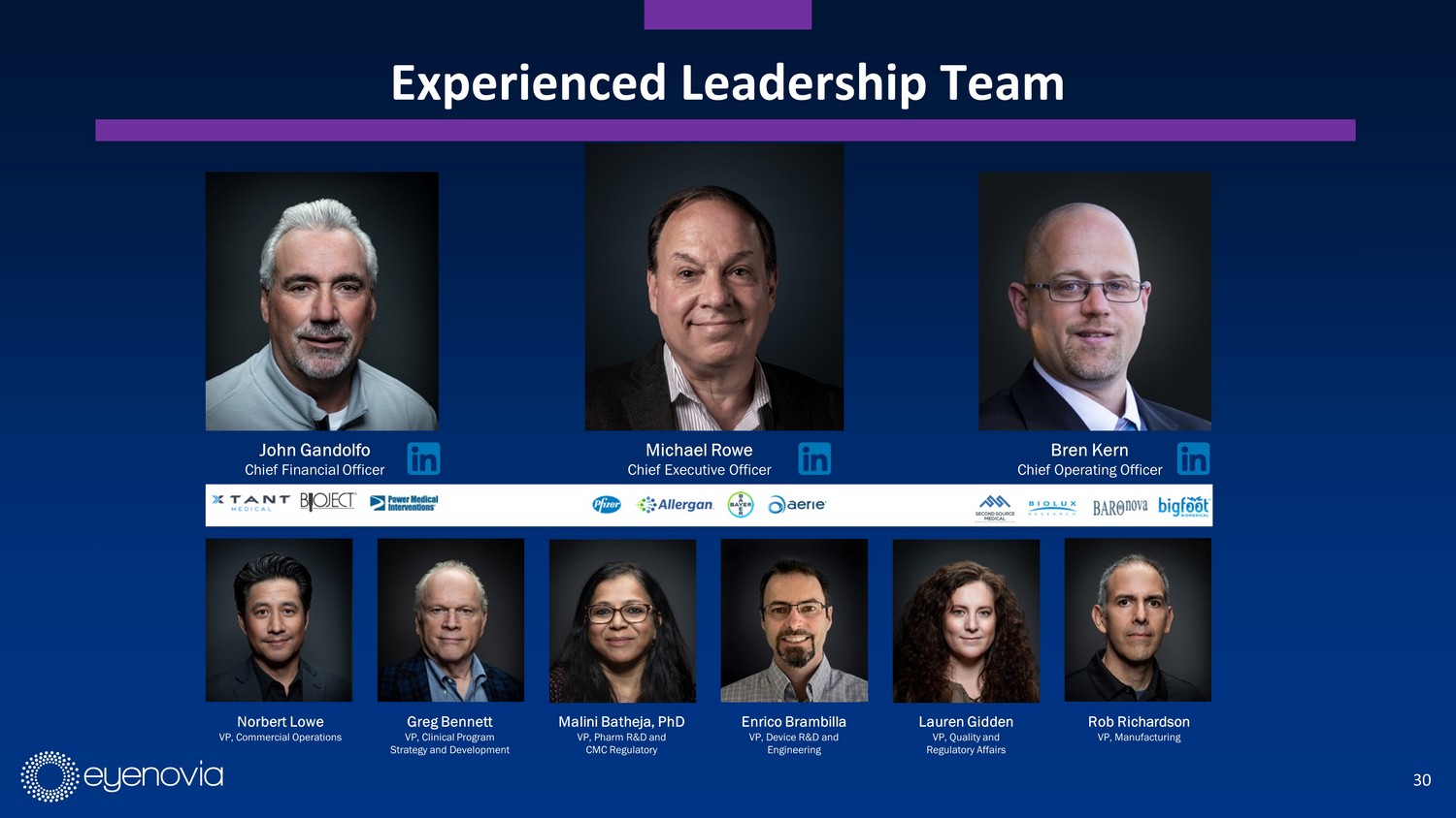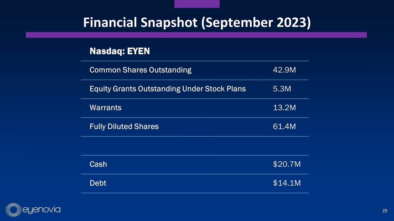 29 Financial Snapshot (September 2023) Nasdaq: EYEN Common Shares Outstanding 42.9M Equity Grants Outstanding Under Stock Plans 5.3M Warrants 13.2M Fully Diluted Shares 61.4M Cash $20.7M Debt $14.1M