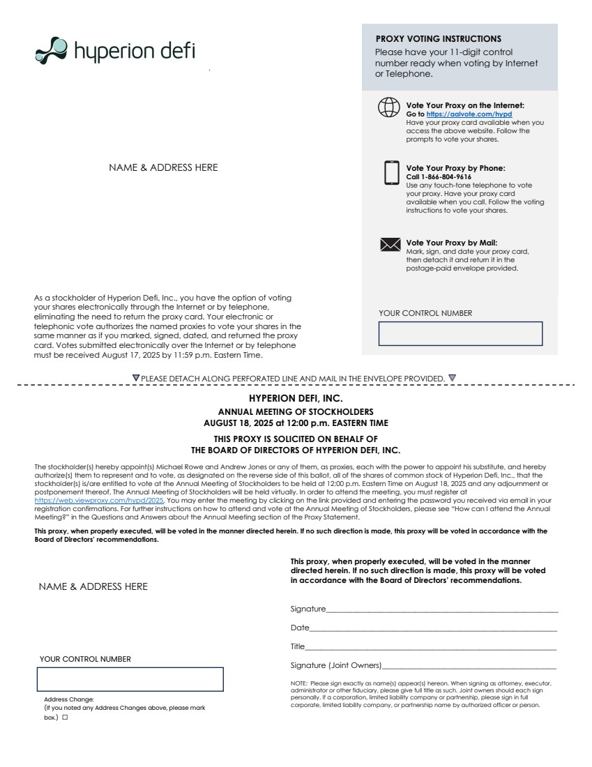 This proxy statement (the “Proxy Statement”), along with the accompanying notice of the 2025 annual meeting of stockholders (the “Annual Meeting”), is furnished to the holders of our common stock in connection with the solicitation of proxies on behalf of our Board of Directors for use at the Annual Meeting to be held virtually on August 18, 2025 at 12:00 PM EDT at the following website address: https://web.viewproxy.com/hypd/2025AM, or for use at any adjournment or postponement thereof, for the purposes set forth herein and in the accompanying Notice of Annual Meeting of Stockholders (the “Notice”). Only stockholders of record at the close of business on July 18, 2025 are entitled to notice of and to vote at the meeting. In this Proxy Statement, we refer to Hyperion DeFi, Inc. as “Hyperion DeFi,” “Company,” “we” and “us.”