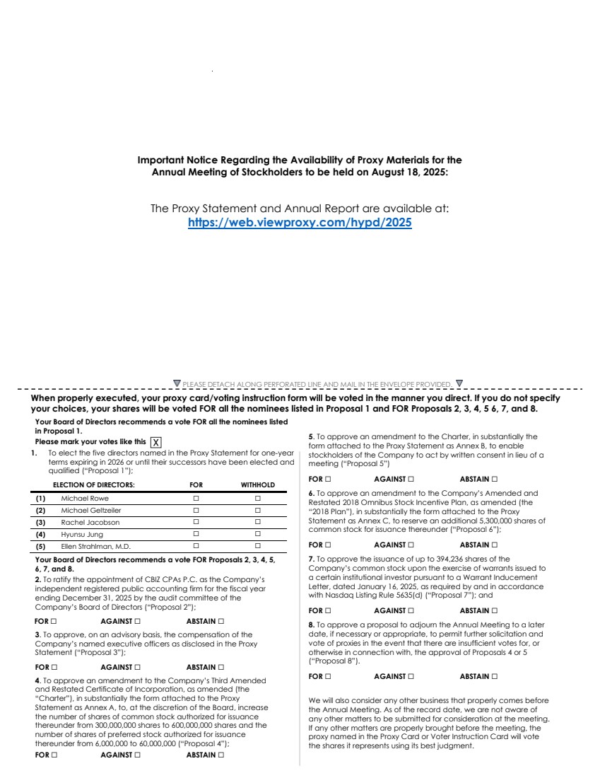 A: We will host the Annual Meeting live via the Internet. You will not be able to attend the meeting in person. Participation in and attendance at the Annual Meeting is limited to stockholders as of the close of business on July 18, 2025. Such stockholders can listen to and participate in the Annual Meeting live via the Internet at https://web.viewproxy.com/hypd/2025AM. The webcast will begin at 12:00 PM EDT, on August 18, 2025. Online access will begin at 11:45 AM EDT, and we encourage you to access the Annual Meeting prior to the start time.