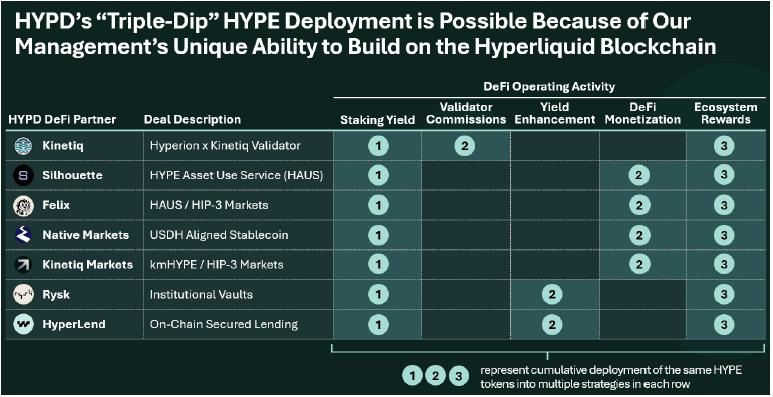 Our businesses are designed to simultaneously promote and monetize adoption of the Hyperliquid blockchain. In Q4, our unique ability to “triple-dip” our HYPE tokens across multiple deployment strategies generated ~3x the income would have otherwise generated from staking in isolation. Our “HYPD Triple-Dip” strategy is: