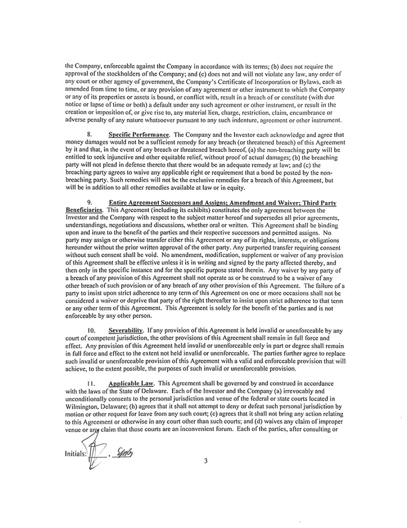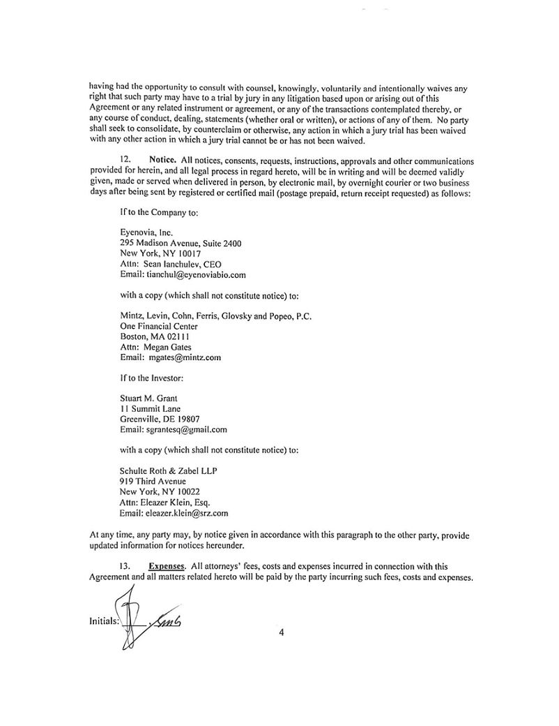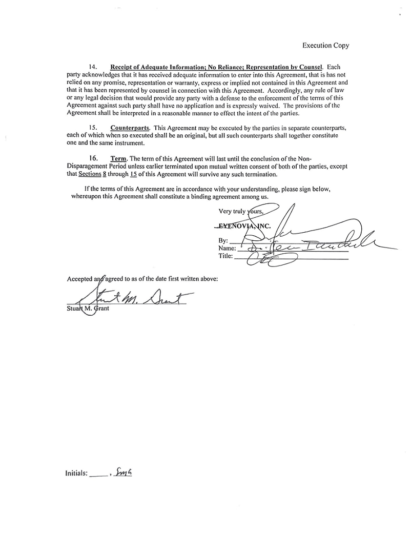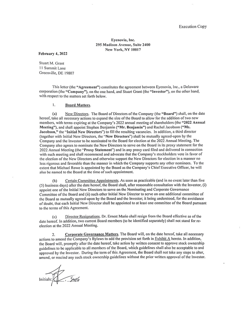 February 4, 2022 Stuart M. Grant 11 Summit Lane Greenville, DE 19807 Eycnovia, Inc. 295 Madison Avenue, Suite 2400 New York, NY !0017 Execution Copy This letter (the •~Agreement") constitutes the agreement between Eyenovia, Inc., a Delaware corporation (the "Company"}, on the one hand, and Stuart Grant (the "Investor"), on the other hand, with respect to the matters set forth below. l. Board Matters. (a) New Directors. The Board of Directors of the Company (the "Board") shall, on the date hereof, take all necessary actions to expand the size of the Board to allow for the addition of two new members, with terms expiring at the Company's 2022 annual meeting of shareholders (the "2022 Annual Meeting"), and shall appoint Stephen Benjamin ("Mr. Benjamin"} and Rachel Jacobson ("Ms. Jacobson," the "Initial New Directors") to fill the resulting vacancies. In addition, a third director (together with Initial New Directors, the "New Directors") shall be mutually agreed-upon by the Company and the Investor to be nominated to the Board for election at the 2022 Annual Meeting. The Company also agrees to nominate the New Directors to serve on the Board in its proxy statement for the 2022 Annual Meeting (the "Proxy Statement") and in any proxy card filed and delivered in connection with such meeting and shall recommend and advocate that the Company's stockholders vote in favor of the election of the New Directors and otherwise support the New Directors for election in a manner no less rigorous and favorable than the manner in which the Company supports any other nominees. To the extent that Michael Rowe is appointed by the Board as the Company's Chief Executive Officer, he will also be named to the Board at the time of such appointment. (b) Certain Committee Appointments. As soon as practicable (and in no event later than five (5) business days) after the date hereof, the Board shall, after reasonable consultation with the Investor, (i) appoint one of the Initial New Directors to serve on the Nominating and Corporate Governance Committee of the Board and (ii) such other Initial New Director to serve on one additional committee of the Board as mutually agreed-upon by the Board and the Investor; it being understood, for the avoidance of doubt, that each Initial New Director shall be appointed to at least one committee of the Board pursuant to the terms of this Agreement. (c) Director Resignations. Dr. Ernest Mario shall resign from the Board effective as of the date hereof. In addition, two current Board members (to be identified separately) shall not stand for reelection at the 2022 Annual Meeting. 2. Corporate Governance Matters. The Board will, on the date hereof, take all necessary actions to amend the Company's Bylaws to add the provision set forth in Exhibit A hereto. In addition, the Board will , promptly after the date hereof, take action by written consent to approve stock ownership guidelines to be applicable to all members of the Board, which guidelines shall also be acceptable to and approved by the Investor. During the term of this Agreement, the Board shall not take any steps to alter, amend, or rescind any such stock ownership guidelines without the prior written approval of the Investor. 3. Withdrawal of Section 220 Demand and Shareholder Proposal. The Investor hereby withdraws his demand for certain books and records of the Company pursuant to Section 220 of the Delaware General Corporation Law and his shareholder proposal under Ruic 14a-8 under the Securities Exchange Act of 1934, as amended, regarding a mandatory retirement age for members of the Board. Promptly following the execution and delivery of this Agreement, the Company will file a Current Report on Fann 8-K, which will report the resignation of Dr. Mario, the amendment to its Bylaws, and the entry into this Agreement. The Investor shall be given a reasonable opportunity to review and comment on such Current Report on Fann 8-K or other filing with the SEC to be made by the Company with respect to this Agreement, and the Company shall give reasonable consideration to any comments of the Investor. In addition, the Company shall be given a reasonable opportunity to review and comment on any Schedule 13D filing or other filing with the SEC to be made by the Investor with respect to this Agreement, and the Investor shall give reasonable consideration to any comments of the Company. 4. Company Policies. The parties hereto acknowledge that the New Directors, upon appointment to the Board, will serve as members of the Board and will be governed by the same protections and obligations regarding confidentiality, conflicts of interest, related party transactions, fiduciary duties, codes of conduct, trading and disclosure policies, and other governance guidelines and policies of the Company as are other directors of the Company, and shall be required to preserve the confidentiality of Company business and infonnation, including discussions or matlers considered in meetings of the Board or Board committees, and shall have the same rights and benefits, including with respect to insurance, indemnification, compensation and fees, as are applicable to all independent directors of the Company. S. Non-Disparagement. From the date hereof until the date that is thirty (30) days before the opening of the period during which, pursuant to the Bylaws, stockholders may timely and validly submit proposals for consideration at the 2024 annual meeting of stockholders of the Company (the "Non-Disparagement Period"), the Company and the Investor shall each refrain from making, and shall cause their respective affiliates and respective principals, directors, members, general partners, officers and employees not to make or cause to be made any statement or announcement, including in any document or report filed with or furnished to the SEC or through the press, media, analysts or other persons, that constitutes an ad hominem attack on, or otherwise disparag