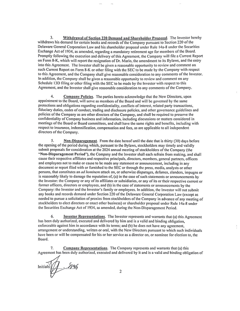 Pursuant to the Settlement Agreement, the Reporting Person has agreed, among other things, to withdraw the Stockholder Demand and the Stockholder Proposal.